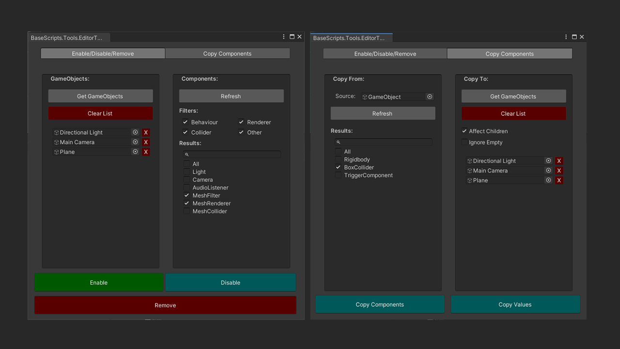Also allows users to copy componants and/or componant values from a selected GameObject to a list of GameObjects. Works recursively too.